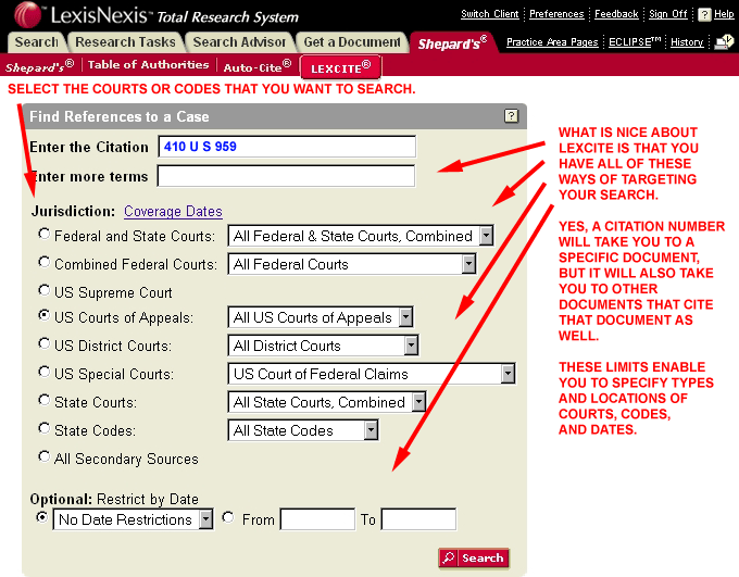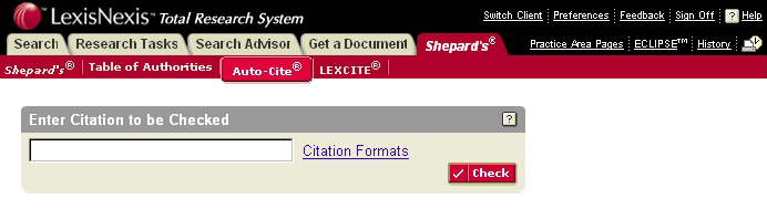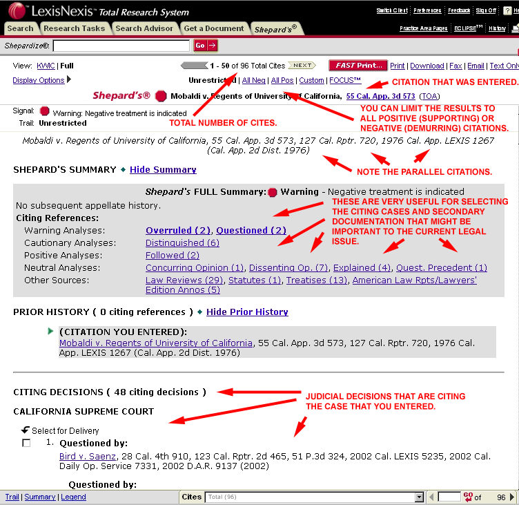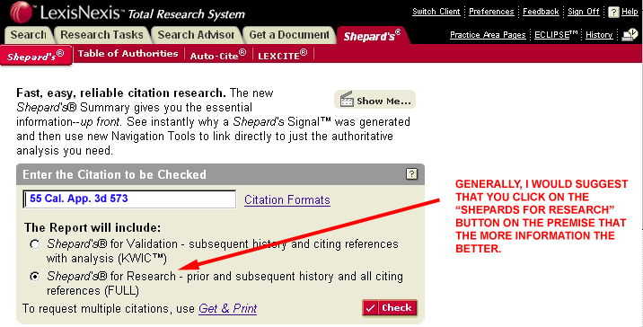 - Shepard's for Research - This provides the more comprehensive citation search results, including prior history and subsequent history, particularly the appelate history of the case. This "full" format also provides additional citations to and from other cases, statutes, and secondary sources.